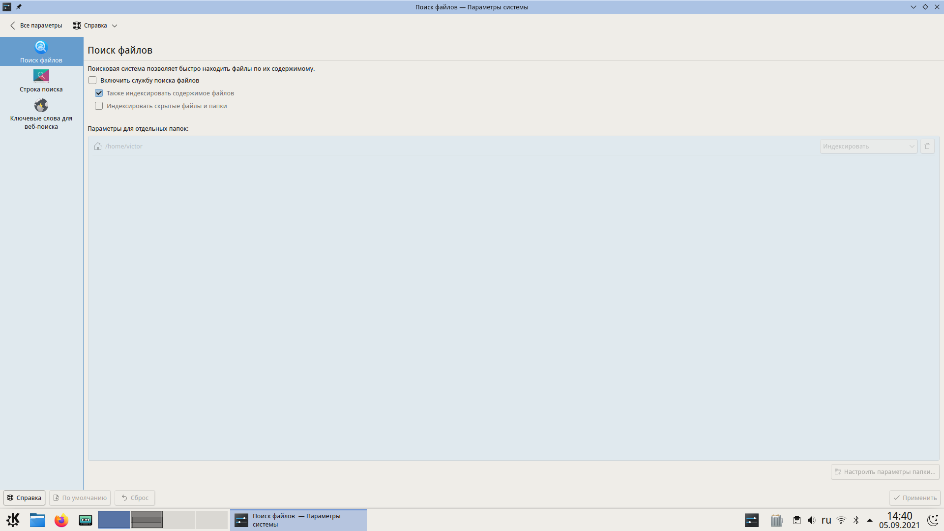 У нас индексирование отключается конфигом в пакете plasma5-config-fresh. Отключал его лет пять назад, ещё Андрей, по моей просьбе. Я скидывал ему конфиг отключения. При загрузке livecd система тупила на слабых машинах, так как начиналось индексирование. Решил, что пользователь сам его включит, если нужно.