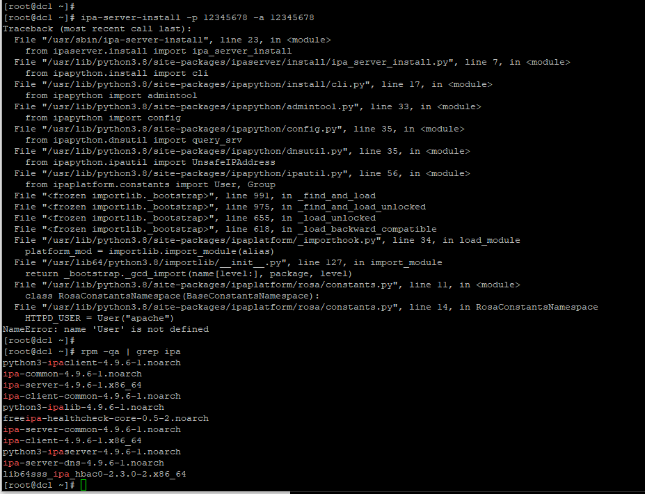 Created attachment 5508 [details] ipasrv1.png freeipa сервер не ставится ====================== [root@dc1 ~]# ipa-server-install -p 12345678 -a 12345678 Traceback (most recent call last): File "/usr/sbin/ipa-server-install", line 23, in <module> from ipaserver.install import ipa_server_install File "/usr/lib/python3.8/site-packages/ipaserver/install/ipa_server_install.py", line 7, in <module> from ipapython.install import cli File "/usr/lib/python3.8/site-packages/ipapython/install/cli.py", line 17, in <module> from ipapython import admintool File "/usr/lib/python3.8/site-packages/ipapython/admintool.py", line 33, in <module> from ipapython import config File "/usr/lib/python3.8/site-packages/ipapython/config.py", line 35, in <module> from ipapython.dnsutil import query_srv File "/usr/lib/python3.8/site-packages/ipapython/dnsutil.py", line 35, in <module> from ipapython.ipautil import UnsafeIPAddress File "/usr/lib/python3.8/site-packages/ipapython/ipautil.py", line 56, in <module> from ipaplatform.constants import User, Group File "<frozen importlib._bootstrap>", line 991, in _find_and_load File "<frozen importlib._bootstrap>", line 975, in _find_and_load_unlocked File "<frozen importlib._bootstrap>", line 655, in _load_unlocked File "<frozen importlib._bootstrap>", line 618, in _load_backward_compatible File "/usr/lib/python3.8/site-packages/ipaplatform/_importhook.py", line 34, in load_module platform_mod = importlib.import_module(alias) File "/usr/lib64/python3.8/importlib/__init__.py", line 127, in import_module return _bootstrap._gcd_import(name[level:], package, level) File "/usr/lib/python3.8/site-packages/ipaplatform/rosa/constants.py", line 11, in <module> class RosaConstantsNamespace(BaseConstantsNamespace): File "/usr/lib/python3.8/site-packages/ipaplatform/rosa/constants.py", line 14, in RosaConstantsNamespace HTTPD_USER = User("apache") NameError: name 'User' is not defined [root@dc1 ~]# ================================= [root@dc1 ~]# rpm -qa | grep ipa python3-ipaclient-4.9.6-1.noarch ipa-common-4.9.6-1.noarch ipa-server-4.9.6-1.x86_64 ipa-client-common-4.9.6-1.noarch python3-ipalib-4.9.6-1.noarch freeipa-healthcheck-core-0.5-2.noarch ipa-server-common-4.9.6-1.noarch ipa-client-4.9.6-1.x86_64 python3-ipaserver-4.9.6-1.noarch ipa-server-dns-4.9.6-1.noarch lib64sss_ipa_hbac0-2.3.0-2.x86_64