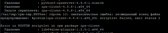Created attachment 5509 [details] ipasrv2.png При удалении ipa-server, удаляется ipa-client, но в пакете ipa-client ошибка. ==================== Удаление : ipa-client-4.9.6-1.x86_64 16/451 Запуск скриптлета: ipa-client-4.9.6-1.x86_64 16/451 /var/tmp/rpm-tmp.N9U9se: строка 10: синтаксическая ошибка: неожиданный конец файла предупреждение: %postun(ipa-client-4.9.6-1.x86_64) scriptlet failed, exit status 2 Error in POSTUN scriptlet in rpm package ipa-client ====================