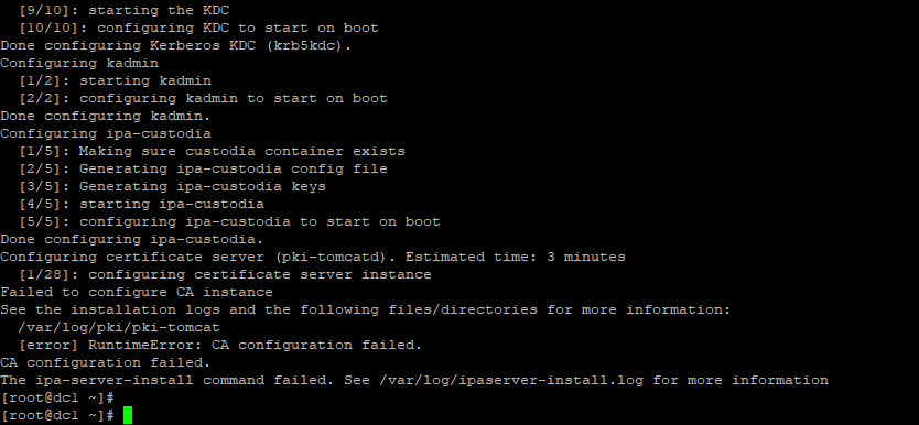 Created attachment 5519 [details] ipasrv3.png Сейчас вот такую ошибку выдает. Как нас скрине. ========================= Configuring ipa-custodia [1/5]: Making sure custodia container exists [2/5]: Generating ipa-custodia config file [3/5]: Generating ipa-custodia keys [4/5]: starting ipa-custodia [5/5]: configuring ipa-custodia to start on boot Done configuring ipa-custodia. Configuring certificate server (pki-tomcatd). Estimated time: 3 minutes [1/28]: configuring certificate server instance Failed to configure CA instance See the installation logs and the following files/directories for more information: /var/log/pki/pki-tomcat [error] RuntimeError: CA configuration failed. CA configuration failed. The ipa-server-install command failed. See /var/log/ipaserver-install.log for more information [root@dc1 ~]# =============================