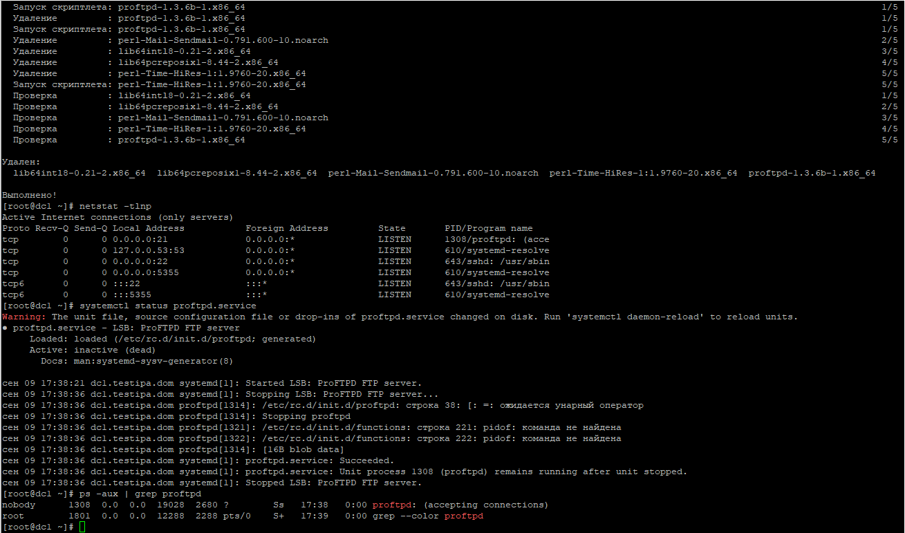Created attachment 5514 [details] proftpd1.png proftpd после остановки сервиса и удаления пакета остается в системе висеть Стоит пакет proftpd. Запущен его сервис. Останавливаем его сервис. Удаляем пакет proftpd. Смотрим netstat, и ps -aux, а там висит proftpd. Вообще его можно было и в Main оставить.