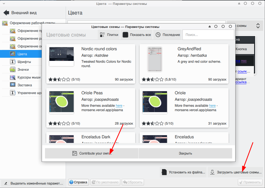 Created attachment 5532 [details] нет перевода кнопки Не переведена кнопка "Contribute your own" в диалоге выбора цветовой схемы KDE, см. скриншот. Я бы перевел, например, так: "Поделиться своей схемой"